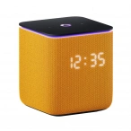 Корпус колонки, выполненный из ткани, не только стильно выглядит, но и обеспечивает приятные тактильные ощущения, защищает динамики и смягчает звук. Встроенный экран светится на текстильной поверхности.